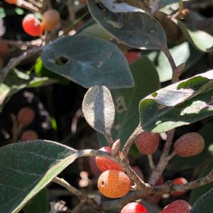 秋の陽光を浴びたツヤツヤの実 "マルバアキグミ" ①果実 ②花 口に入れてみたけど甘くない😅 マルバアキグミはアキグミの海岸型変種です。 海岸付近に生える落葉低木で、葉が丸みを帯びて厚く、表面に銀白色の鱗状毛が密生しています。 4月頃に香りの強い花を咲かせ、秋には熟した赤い実をつけ食べることができます。 グミ科、グミ属