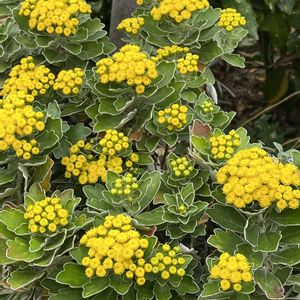 今日のお花 イソギク(磯菊) *キク科キク属 花期は10末-11月 自生は千葉県犬吠埼〜愛知県渥美半島.伊豆諸島! 日本海側は京都.島根.山口県の海岸の岩石地や崖に生える海浜植物の多年草! 葉は厚く倒卵形〜倒披針形で全縁〜上半分が浅く裂ける! 縁が白い線で縁取られる! 黄色い頭花が上向きに多数付き筒状花だけで、舌状花は無い! これは植栽か自生かは分かりませんが、丈夫で育てやすい事から北国でも植栽で良く見かけます! 11月24日撮影
