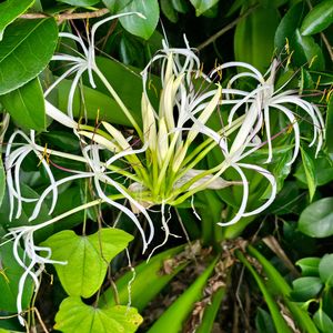 今日のお花 ハマユウ(ハマオモト) *ヒガンバナ科ハマオモト属 瀬戸内海に沿って走る県道沿いに 昨年も花が咲いていた 昔は海辺であったのに埋め立てられて道ができ海浜から離されたのかもしれない ハマオモトが分布する北限を示す*ハマオモト線*は山口県北部から伊勢湾を経て銚子に至る線で 具体的には年平均気温が15度の等温線に一致するという さて今時の異常気象を考えるとハマオモト線も北上しているのではないだろうか
