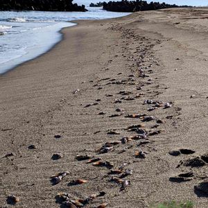 朝のお散歩🐕 海岸でホタルイカの身投げに出会ました。 昨夜は綺麗な青い発光ショウが見られたでしょうね💙 春だな〜🌅🎶