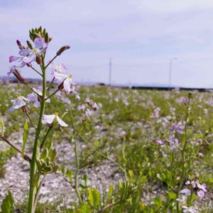 💜🤍🤍ハマダイコン💜🤍🤍🌿 💜🤍🌿アブラナ科の多年草 海岸近くの空き地にたくさん咲いていました🌿🌿 畑から逃げ出して野良になった大根🌿 冬のハマダイコンは食べられますが大根おろしにすると普通の大根の10倍くらい辛いそうです🥵 わさびの代わりになるかも?ですね😅