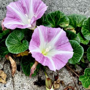 ハマヒルガオ(浜昼顔) *ヒルガオ科ヒルガオ属 花期は5〜6月 海岸の砂浜に群生する。 要注意外来生物のコマツヨイグサの増加で 減少しているようです! 津波後の復興工事のコンクリートの隙間から元気に花を咲かせていました!