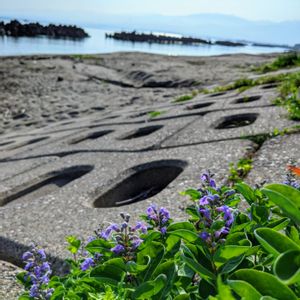 夏の朝 淡く遠くに山、キラキラの海、テトラポット、砂浜、海岸で見かけた青い花💙 アップで再投稿