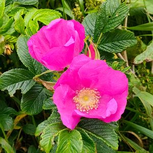 「今日のお花」 ハマナスも色々な所で見かけました🌺🩷🎶 バラ科 バラ属 落葉低木 別名ハマナシ 「木曜日は木」にもタグ付けさせていただきます🙇♀️🎶 耐寒性が強く海岸などに自生し、初夏に花をつける。 日本では北海道で最も多くみられる。 原産地は日本~東アジアで、英語では、Japanese Roseと呼ばれることもある。昭和53年7月26日に北海道の花に指定されている。 初夏になると花は浜辺を美しく彩り、よい香りがする。 花後にミニトマトのような形のだいだい色の実をつける。 筑波実験植物園では6月中旬にはオレンジ色の果実🍊を付けていましたが、北の島ではこれから色付くのですね🧡🎶