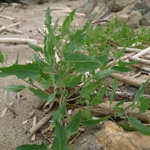 ハマアカザ(浜藜) ヒユ科 ハマアカザ属 8~10月 40~60cm 在来種 一年草 海岸砂地 まだ若い株のようです 葉は互生 長さ2~8 ㎝、幅2~4 ㎝の三角状卵形~長卵形で、縁に不揃いの鋸歯があり、下部の葉の基部は広いくさび形で、ほこ形に張り出す(上向する裂片がある) 上部の葉は細く全縁 葉の表裏、茎に白い粉粒物が付着していました✨✨