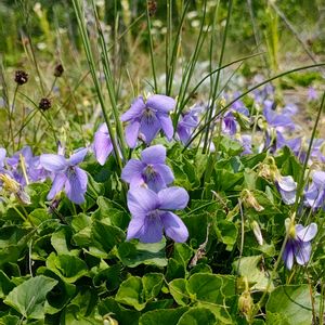 イソスミレ (磯菫) 🌱スミレ科 スミレ属 ✽大きな地上茎があるスミレで高さ5〜20cm ✽こんもりした大きな株をつくる ✽葉は広心形で厚みと光沢があり、表側に巻く ✽托葉はやや浅く裂ける ✽花弁は丸みが強く重なり合うように咲く ✽側花弁は無毛で距は白い 海辺で咲いてるイソスミレ💜