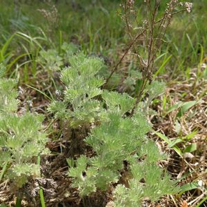 カワラヨモギ(河原蓬) キク科 ヨモギ属 9~10月 30~100cm 在来種 多年草(半低木) 海岸砂浜や河原に生育する 葉は裂片が細く(2回羽状全裂)灰白色の絹毛が密生し、全体に銀緑色にみえる この後花茎を伸ばすが、花茎につく葉の裂片は糸状で絹毛は無く緑色 花茎をつけない茎は高くならず、茎先の葉はロゼット状となり、葉の裂片は同じく線形になるが、絹毛があり白っぽく長柄がある やはり今が一番可愛い(笑) ふんわり仔猫のようです😆