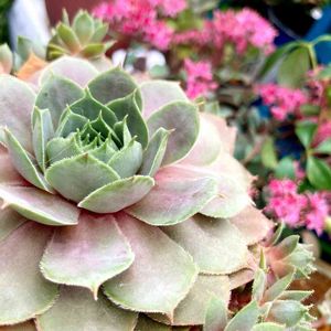 名札魅て吃驚 👀‼️ センペルビウム・プラムパフェさん😺🤍🩷💜 去年の6月に一頭しか無いのに花芽ちゃんを打ち上げてしまい✂️したのですが…🐱 綺麗に出揃ってました😺💜 しかも濃い目のプラム色だったのに柔らかな褪紅色に変化していて…😺🩷 二度吃驚でした😸 中心部がプラム色に戻りつつありますが このお色は今だけ限定カラーです😻💞