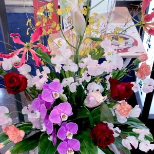 習い事の帰りにデパ地下へ 先週と同じ場所に同じお花(ㆆ_ㆆ)ジーー? よく見たら、使い回し😅 じゃなくて賢く節約🎶🎶🎶 比べてみたら 同じのは胡蝶蘭とオンシジウム、 百合の一部とオレンジのカーネーション👍🏻 取り替えられたのは、 かすみ草→ハラン 百合の一部→グロリオサ ピンクのカーネーション→スイートピー 間違い探しみたいで楽しかった⋆⸜(* ॑꒳ ॑* )⸝ピョンピョン