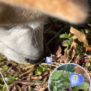 今日のお花 オオイヌノフグリ(オオバコ科クワガタソウ属) ガリバーみたいに見えるでしょうか⁉️ (🐕食べてはいません😆) 春ですねー💕