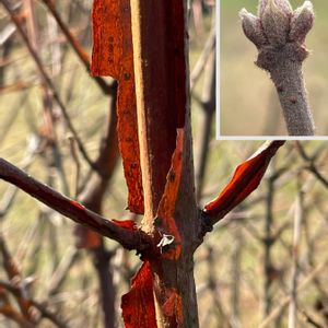 朝🐕散歩 近くの公園の ガマズミ(ガマズミ科) ↗️ 冬芽は同じ株のもの ガマズミも樹皮が剥がれ燃えるように赤く見えます❤️