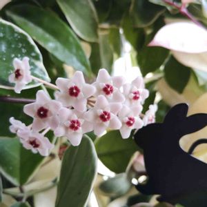 4、5年前からリース状に仕立ててあるホヤ(サクララン)を育てていましたがなかなかバナナが付かず、悩みながら育てていましたがやっと今月咲いてくれました。実物を見るのは初めてです。樹脂粘土で出来ているかのような不思議なお花は可愛らしくてとても綺麗です。 2階の東向の窓辺が気に入ったようです😊