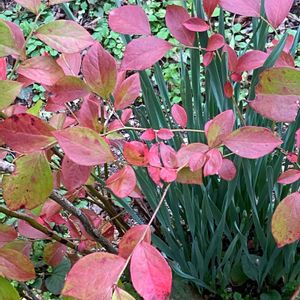 紅葉したブルーベリー 後ろには水仙が 立ち上がって来ました