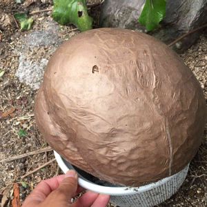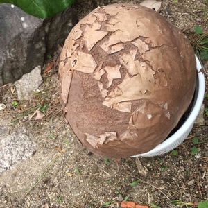 先月投稿しているオニフスベの今! 持ち帰ってからずっと鉢に乗せて置いてました😆 外の白い皮がはげて茶色くなりました! そして亀裂が走り触るとそこから胞子が煙のように出ます😖 このままボフっと爆発するのでしょうか🤯 持ち帰ってから下が濡れるほど水分を出して軽くなり、多分今は中がスポンジの様になっていると思います!