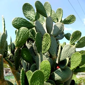 『ウチワサボテン』 車内から見た立派な🌵に赤い花? 確かめると、下から伸びてるゼラニウムの花が間から見えてただけ…序でだから📷 でっかいウチワでした🌵