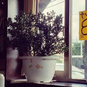 昨日ふらっと入った中華?定食屋?さんの窓際にでーんと置いてあった金のなる木🌳 隣に比較のためのたばこ置きたい … 何年も置いてあるんだろうなー🤔
