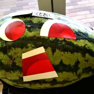 昨日行ったスーパーに飾られていた、ジャンボスイカ🍉 80センチはあったかと‼️ 驚いた様なシールのセンスが良い🙆