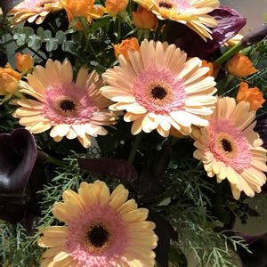 ①② ガーベラの フラワーアレンジ✨ ③ カラシナ? べカナかな? 札を付けそびれたので、育ってか らのお楽しみです😅 ④収穫前の聖護院大根✨ ⑤ 収穫後の聖護院大根と 間引き菜と茎ブロッコリー✨