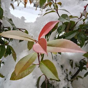 雪を背景にベニカナメの真っ赤な新芽が新鮮ですね❄️🍂