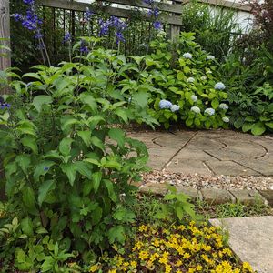 リシマキアミッドナイトサンと、ブルーサルビアと、アジサイが咲いてます。