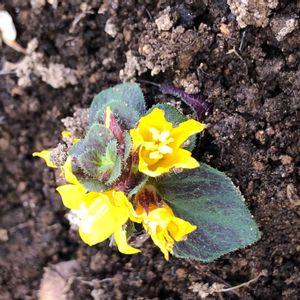 職場の花壇で見つけました🌿渋い色の葉っぱに黄色のお花💛中央の葉っぱもお花に見えますね。