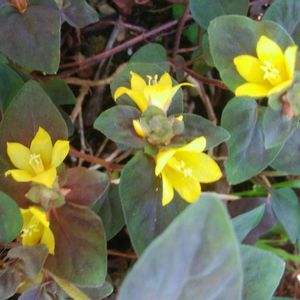 これはkunimaruさんに教えてもらった リシマキア・ミッドナイトサンというものです。 ヌンムラリアしか知らなかった私に、「○色のお花が咲きますよ」と教えていただいていましたが、昨日咲いてるのに気づきました 😯😯😯 正解は「黄色の花」でしたね👍👍👍 ヌンムラリア・オーレアはかなり枝が育たないと花がつかないのですが、これは購入して数ヶ月で開花😄