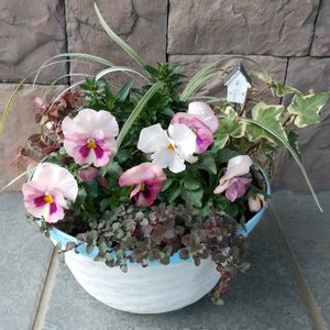 セールの陶器鉢に寄せ植え作りました。白い鉢は汚れが目立つなあ