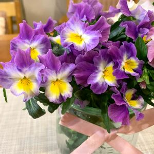 おはようございます☀ 今シーズンはビオラ、パンジーの徒長が早いです😅💦 ビオラ・ファーマーズクラフトをリビングに飾りました💜💛もう少し楽しめそうです😊