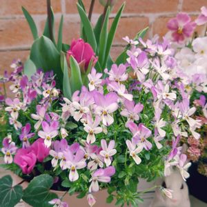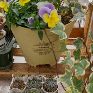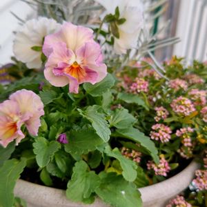 旧苗 *シロタエギク *葉牡丹 *アリッサム *アイビー 今季、お迎えしたビオラとストックを~ 実は中央に別苗を植えてたけど、元気が無くなり💦あった🩷を植え直ししたけど、合わないかと悩み鉢です😟 *スプラッシュメドウ💚 去年も、今季も植え替えてないけど咲いてくれた😂