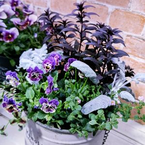 *シャルロット 中輪タイプのフリンジ系ビオラ *丸葉シロタエギク もふもふ しろうさぎ *ティントルージュ 株分け🩶🍀は、少し入れて~ 咲いてたバコパは、一休みに😅