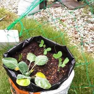 きゅうりを撤去した袋の土を一度出して、根を取り除き苦土石灰と化成肥料を混ぜ込んで戻した所に植えた、自家採種の芽キャベツとダイソーの種からのつるありスナップエンドウです。 スナップエンドウはつるありなのでキュウリを這わせていた網をこのまま使いたいと思っています。 窓辺に張った網ですが、豆の花はスイトピーだと思えばキレイですしね(笑) 網と逆側の日当たりのいい方に向けて芽キャベツを植えました。