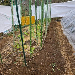 スナップエンドウ 少しだけ成長しました ツルの先が着いて安定 男爵じゃが芋 芽出し終えてから、先週植え付けしました 黒マルチと虫除けも兼ねて寒冷紗取付完成です 芽は、まだ出てません 雷鳴とともに、雪が降ったので退散しました