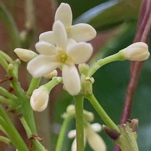 🌳庭に植えっぱなしシリーズ🌳😅 10年選手の四季咲き木犀🌼 本名は銀木犀なのかな🙄? 今日見たら、結構花が咲いてました😊🌼 お庭作りや外構工事をするお店の オープンガーデン🏡🌲で購入したものですが、付いてた名札には「四季咲き木犀」って書いてあったんですよね〜🙄 高さは1.5mくらい(剪定はたまにしている😁✂)、 金木犀より めちゃ控えめな香り🤫 窓を開けても香りに気付かないくらい😅(私だけ?) クリーム色の可愛い花🌼 そう言えば、秋以外にもたまに咲いてるかも🙁? なんせ植えっぱなしだから····😑💧 GS🍀を始めてから、周りの花が気になりだした私です😅