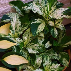 スフレ(紫陽花) 斑入り葉つながりで。 この葉もすごくキレイ。 左側はホスタです。