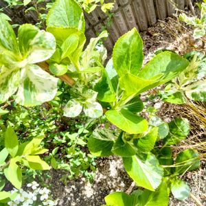 斑入りの葉が大好きで🌱 去年出会った葉を楽しむカラーリーフあじさい【スフレ】💚 鮮やかなマーブル模様に一目惚れ💚😍💘 小さな苗だったのでお花が咲かないのを覚悟で剪定はしませんでした✂️🙅♀️ 一年過ぎて今日のスフレちゃん・・・▶️の新芽は先祖返りしたらしくみどりんになっちゃった〜😢 お花は咲かないけど涼しげな斑入りの葉を愛でております💚✨