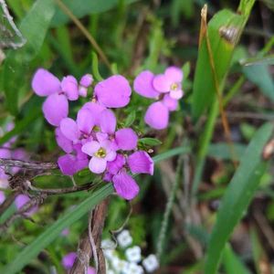ハナダイコン?が咲き出した 紫の花がどんどん増えそう、、、 (2月27日) 追記:ハナダイコンとオオアラセイトウは別種なのかしら?