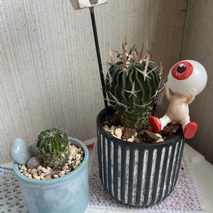 ひやぁぁ〜😱 立派なのが届きました。 ちゃんと、ノギスでサイズ表示してくれてたのに 思い描いていたのと全然違った🤣 まーでかいっ でも、カッコいいな💕💕 花芽もついてる👀 ちび苗の方は、カチカチの石固めたみたいなのに植ってて 植え替えた方がいいよってアドバイスもらってたので植え替えたよ👍 しっかり根っこが詰まってたから、すぐやってよかった😊 おっきい方の 五刺玉(←コレ何って読むの) 最初はちび玉の同じシリーズで四角いのがあって、赤い鉢で植えるつもりだったのだけど とーぜんながら、高さ=深さが足りなかった🤣 コレより深くて大きい鉢って持ってないんだよなー😅 計算違いもいいとこだわ。 でもまぁ渋く決められたのでヨシとします💕 べらぼうかわいいぜ😍 花芽付きなのも、出品者さんには ありがた山のトンビカラス🐦⬛