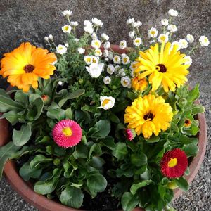 14日に寄植えしました。選んだ花は、デイジーと花かんざし、キンセンカ、あともうひとつはノースポールだったかな?以前、葉牡丹の寄植えした時は「もりもりにしないと!」と思って隙間なく入れ込みましたが、今回は隙間を作りました。でもやはり難しいです。色合いとか背丈を見るために鉢の中にそのままポットをとりあえず置いて見てみるのですが、実際、土を入れたらなんか違ってくる。でも「あそこにこれを、ここにはこの花を」と悩むのも楽しいですね。