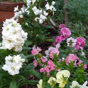 アリッサムのこぼれ鉢の中から、 花壇の水仙やキンセンカの中から…夏の向日葵のこぼれ種をほっといたら、色んなところから🌱がニョキニョキ成長しています😄