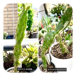 こんばんは😄 一斉紹介(54)です〜❗️🥰 サボテン科 オプンチア属② ⭐️紅花団扇(349) Opuntia bengeriana❗️ また横から📸、風の向きに逆らわないように並べ写真を撮ると横からに❗️😅 風をまともに受けると転けますから❗️😣 ⭐️マーベリック(77) Opuntia tuna f.monstrosa "Marverick"❓ "マーベリック"は"tuna"と言うサボテンのモンスト種❗️数年間見てますが"モンスト種"には見えません❗️😣 では普通の"tuna"に戻ったのか❓ググッと検索❗️😅 "tuna"はどちらかと言うと"将軍" "姫将軍"の様な棒状のサボちゃん❗️🙄 見た目似てるのは"姫珊瑚"⁉️😨 この一反木綿のサボちゃんは"姫珊瑚"❗️😱 ネットで"マーベリック"と言われて買ったのに❗️😣 我が家の"姫珊瑚"と見比べても、同じだ❗️😭 訂正します❗️🙇♀️ ⭐️姫珊瑚(385) Cylindropontia leptocaulis❗️ 別名"細茎団扇"等。 😭うぇ〜ん😭