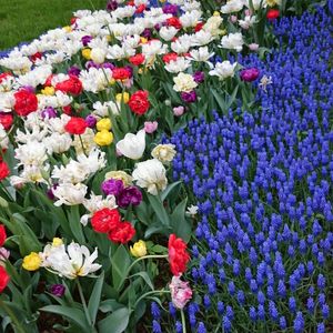 今日のお花、ムスカリ💙✨ 先日チューリップの日に投稿した別のアングルです📱 ムスカリ💙チューリップ🌷ムスカリ💙のサンドイッチです😂🎶ずっと天の川みたいに続いていました🌌😍 2018年4月に撮影した過去picです🙇