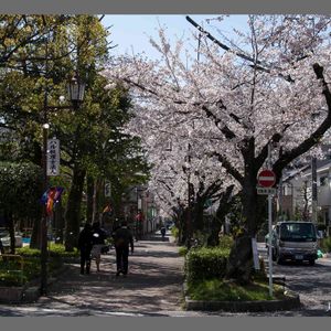名古屋今池のサクラの名所 水道道,20190405撮影。 お花見で散策する人たちの上にハラハラと花びらが舞い降ります。