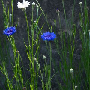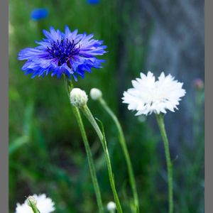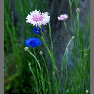 セントーレアの花の白と青が両方画面に入るように撮りました。ヤグルマギクの仲間、と言うことで、そう言われるとなるほどと思いました。20190503撮影。