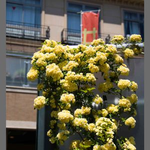 彦根の街の目抜き通り。しゃれた洋館風の街角にモッコウバラの黄色い花が似合います。