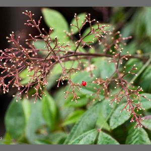 名古屋主税町界隈にて、雨に濡れるナンテンの樹に枝柄に実が一つだけ残っていました。