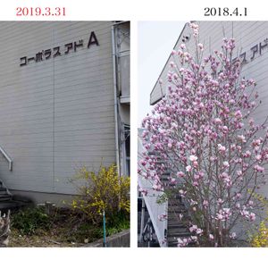 哀れモクレン。今年の春が寒くて季節が遅いのはやむを得ずと,昨年見つけたモクレンが咲き乱れるアパートを訪ねて愕然! なんとバッサリ切られていました。レンギョウだけがすこし残っていました。あんなに綺麗だったのに。どうして?寂しくなりました。