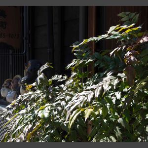 名古屋円頓寺商店街散策。 古物屋さんの軒先の植え込みに強い光を浴びるヒイラギナンテンの植え込みに視線が止まりました。ギラギラ感が出るようにアンダーで撮ってみました。