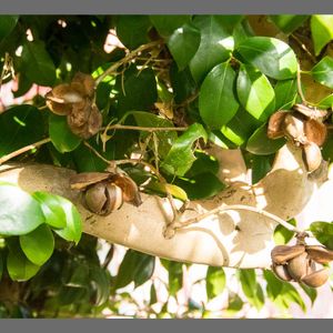 椿の実がはじけてこぼれ落ちそうです。20190209撮影。最寄り駅から自宅に戻る最中カメラ片手にGS散歩です。立派な樹に沢山実が付いていて裂けてタネがこぼれようとしているところでした。