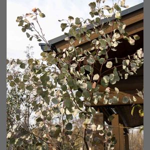 近所のGS散歩で見かけた木です。まん丸の薄い感じ葉がパラパラと着いていて,葉の表と裏の色合いが違うのが面白い感じです。皆様宜しければなまえを教えてください。ユーカリかなにかでしょうか? navyさんからポポラス、マルバユーカリ、と教えて頂きました、ありがとうございました。