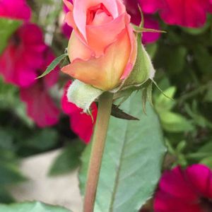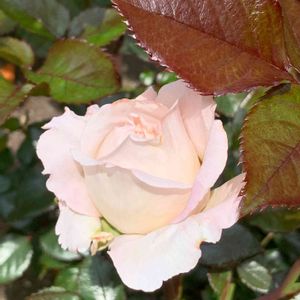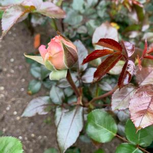 🌹G.D.ルイーズ ✻*॰¨✳︎ 初開花 ♪\♡︎/ 2017年🇩🇪コルデス社作出で、日本では昨年発表されたそうです😊 今月初め、京成バラ園から来た新苗を職場裏のHCで購入しました(^ー^) 花びら多め。グラデーションの効いたアプリコットピンクの花の下の新葉が銅葉〜ダークグリーンに変化しますが、花色とのコントラストが素敵です(ღˇ◡︎ˇღ)♡︎